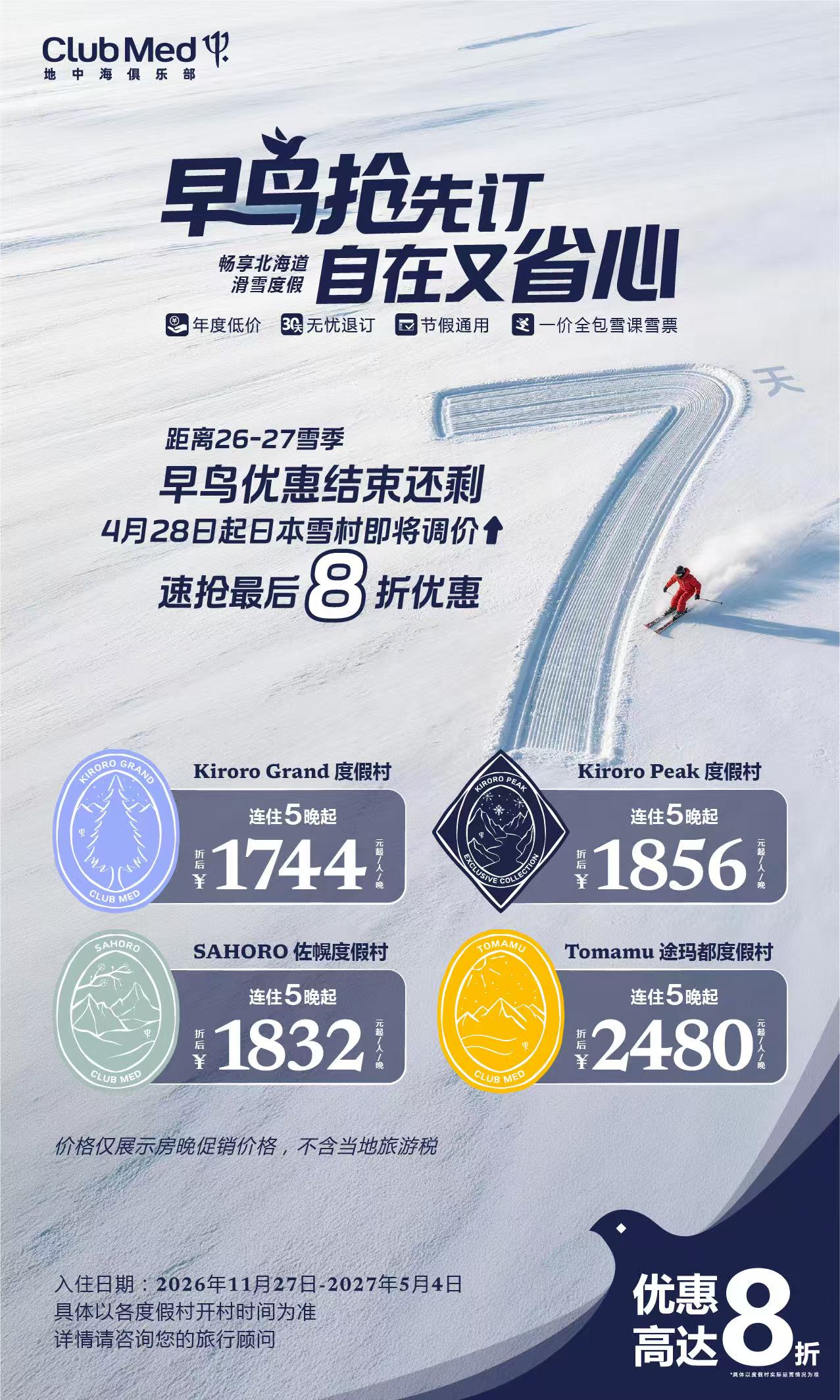 Secure your winter escape to the snowy peaks of Hokkaido with exclusive early bird savings. This season, experience the ultimate "all-inclusive" convenience at one of Japan’s premier ski destinations. Book before the April 28 price adjustment to lock in discounts of up to 20% off (8折) for the upcoming 2026-2027 winter season.